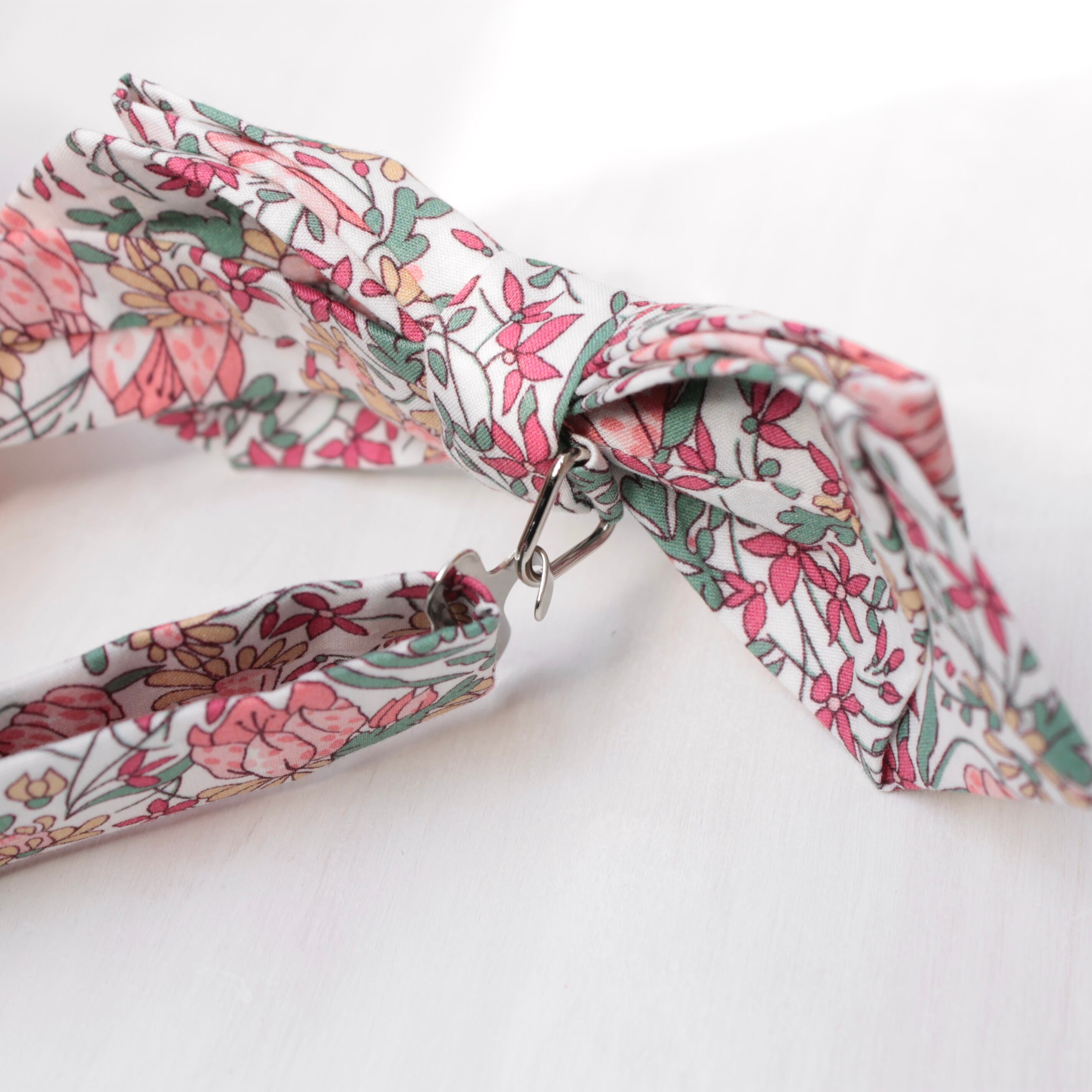 英国テキスタイルブランド、Liberty社の生地を使用しています。上質な光沢感と上品で華やかなデザインが特徴で、ハレの日はもちろん、カジュアルな装いへのワンポイントとしてもおすすめです。