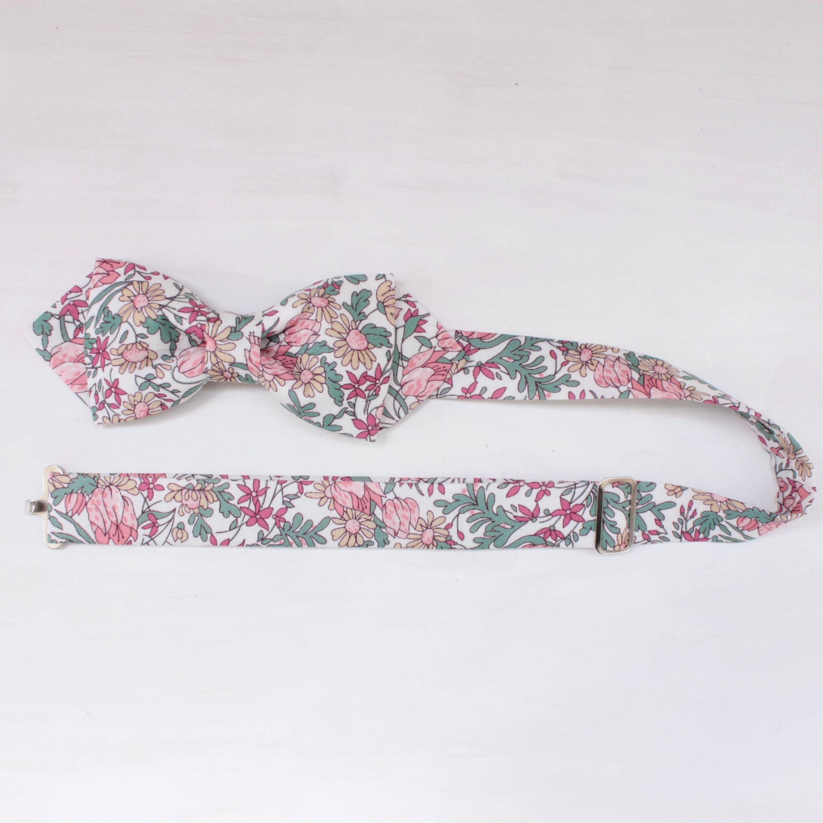 チューリップやデイジーなどの野花が咲き誇る、春にぴったりの蝶ネクタイです。可憐な花々が明るい気分を運び、首元に華やかさを添えてくれます。