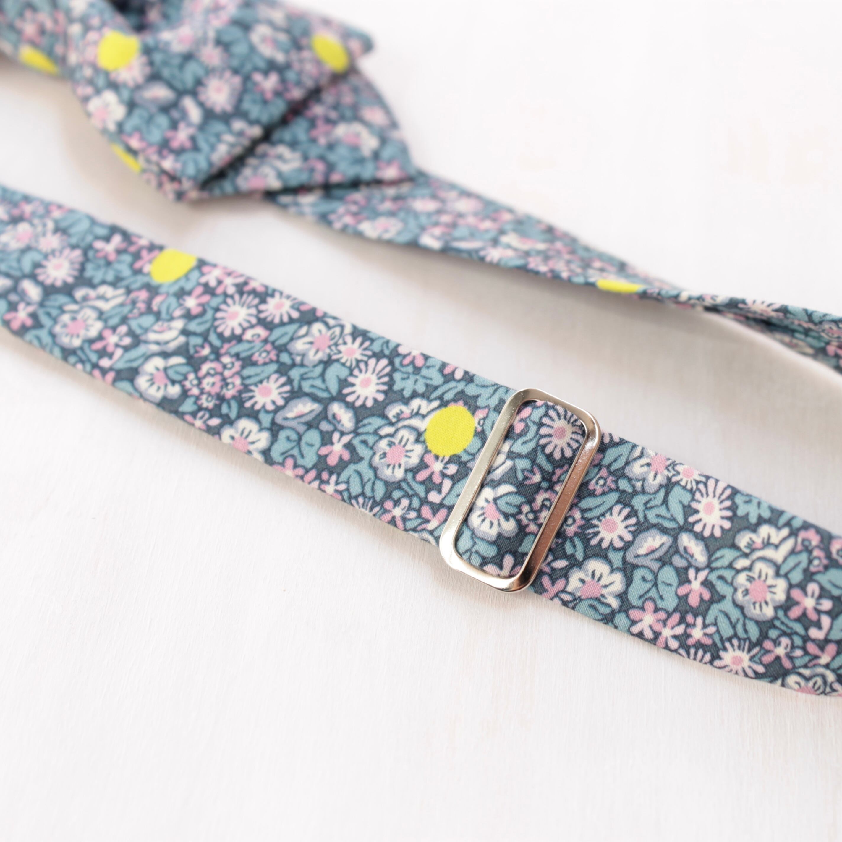 英国テキスタイルブランド、Liberty社の生地を使用しています。上質な光沢感と上品で華やかなデザインが特徴で、ハレの日はもちろん、カジュアルな装いへのワンポイントとしてもおすすめです。