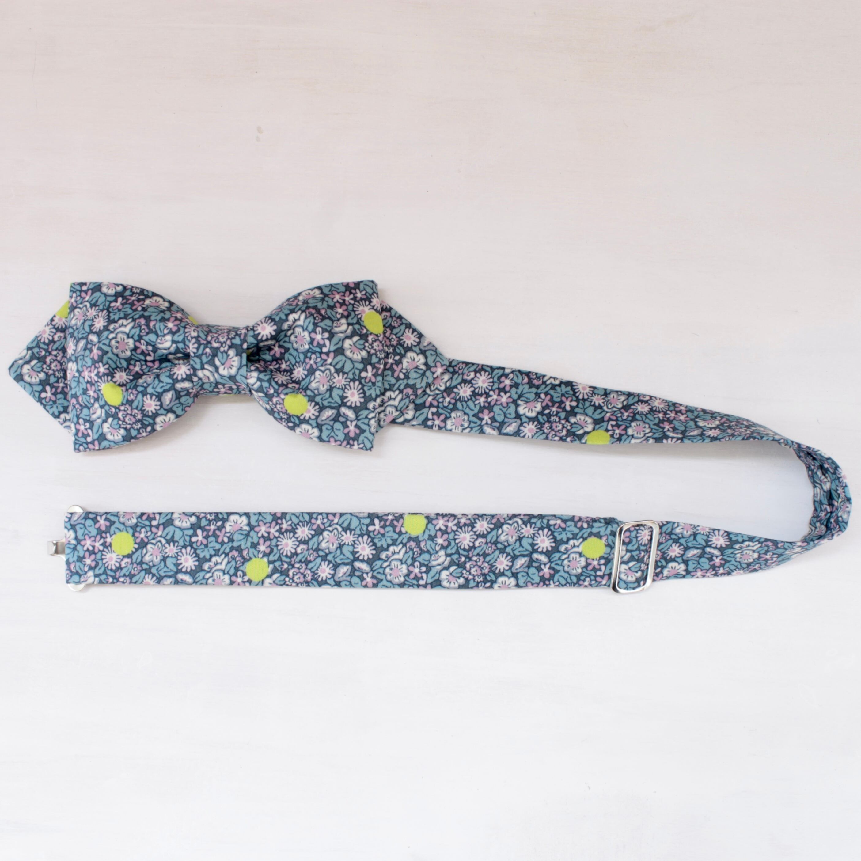エレガントな小花模様に、動きのあるドットの組み合わせが楽しく、フォーマルなシーンでもほどよい抜け感のある蝶ネクタイです。