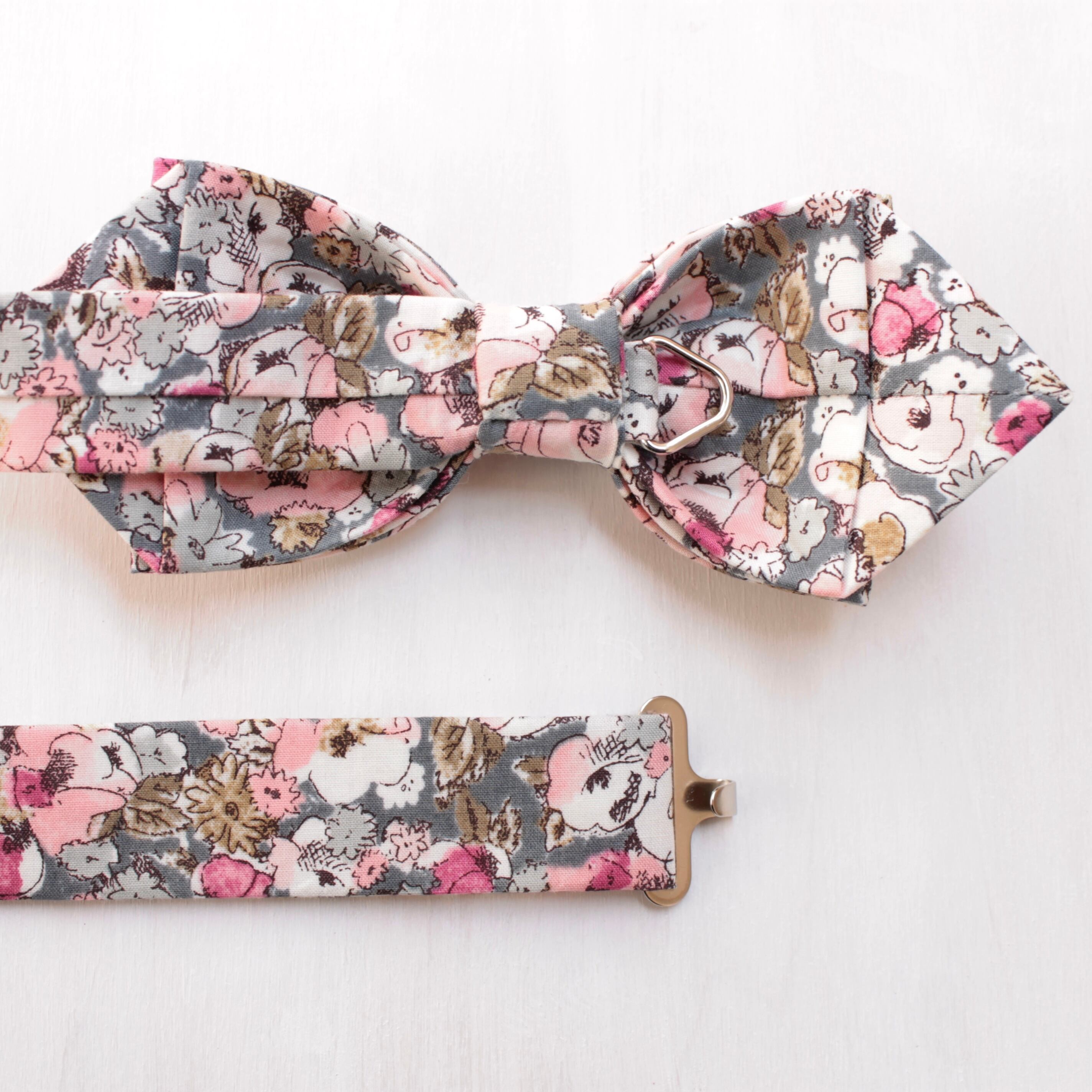 ピンクとグレーの配色が目を引くこちらの蝶ネクタイは、シックな雰囲気は残しつつも、遊び心のあるお洒落なアイテムとなっております。