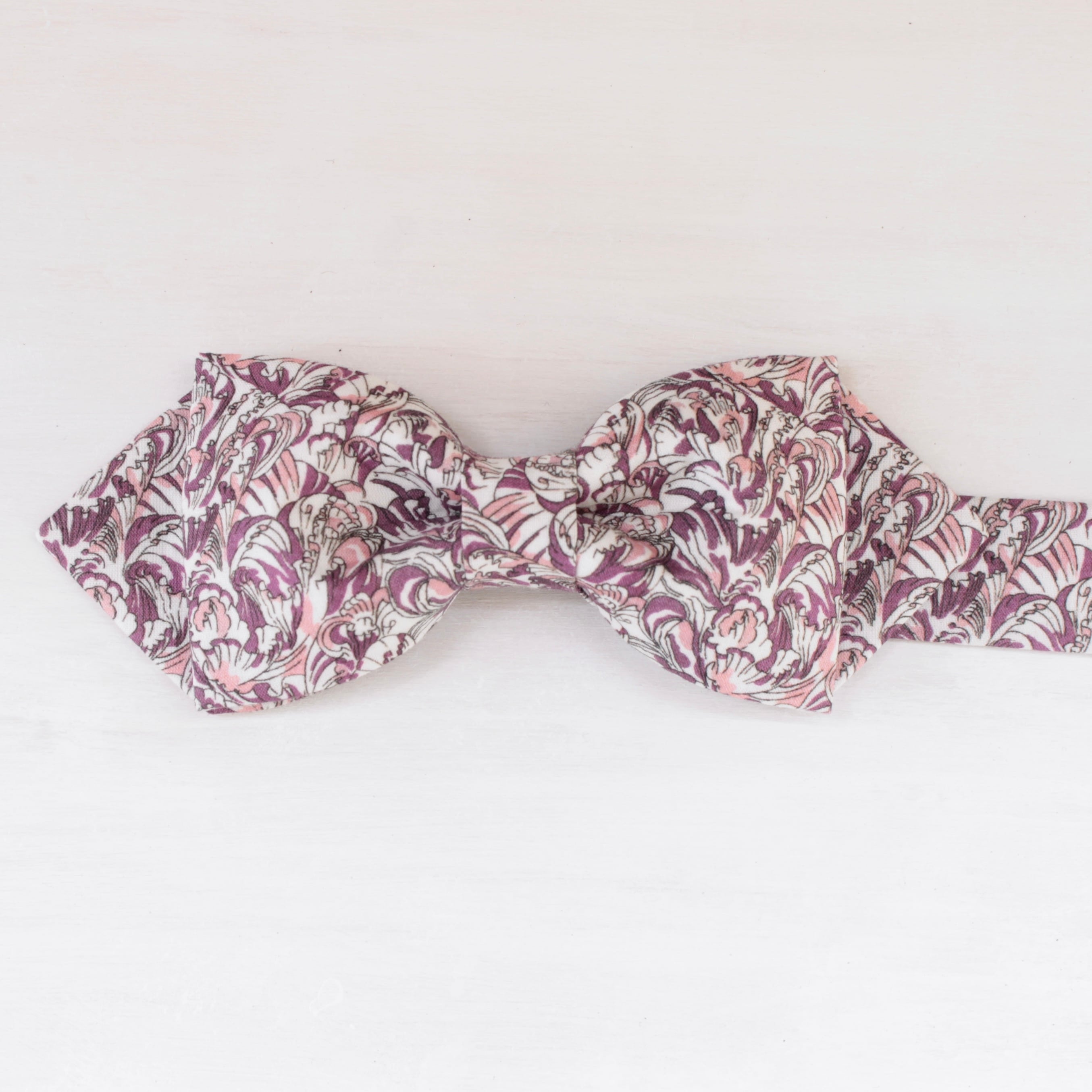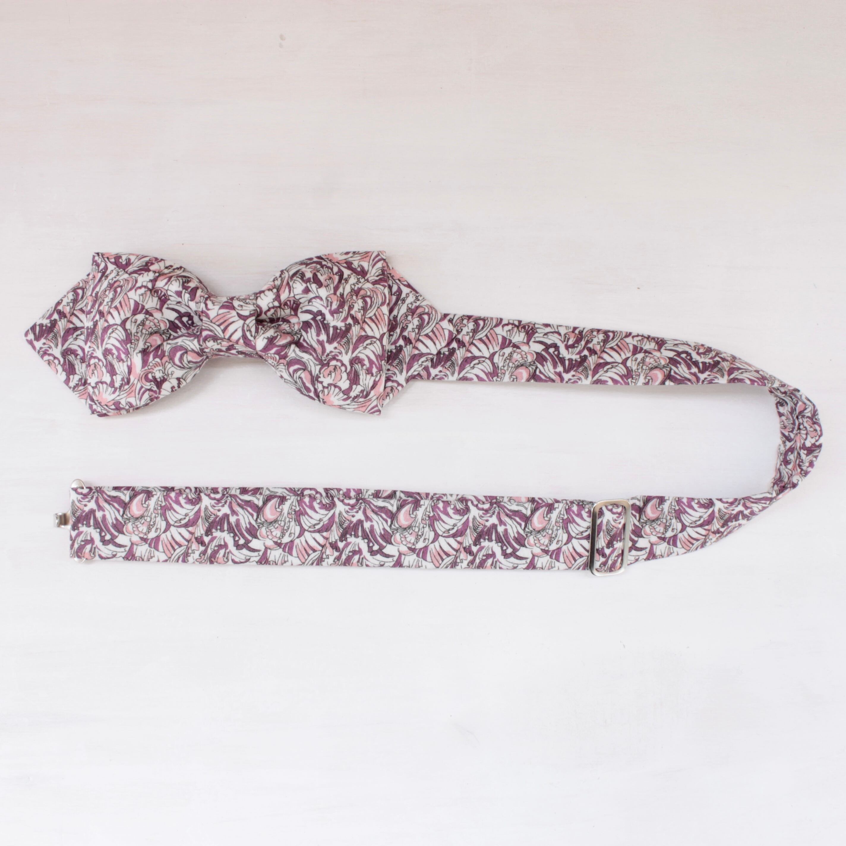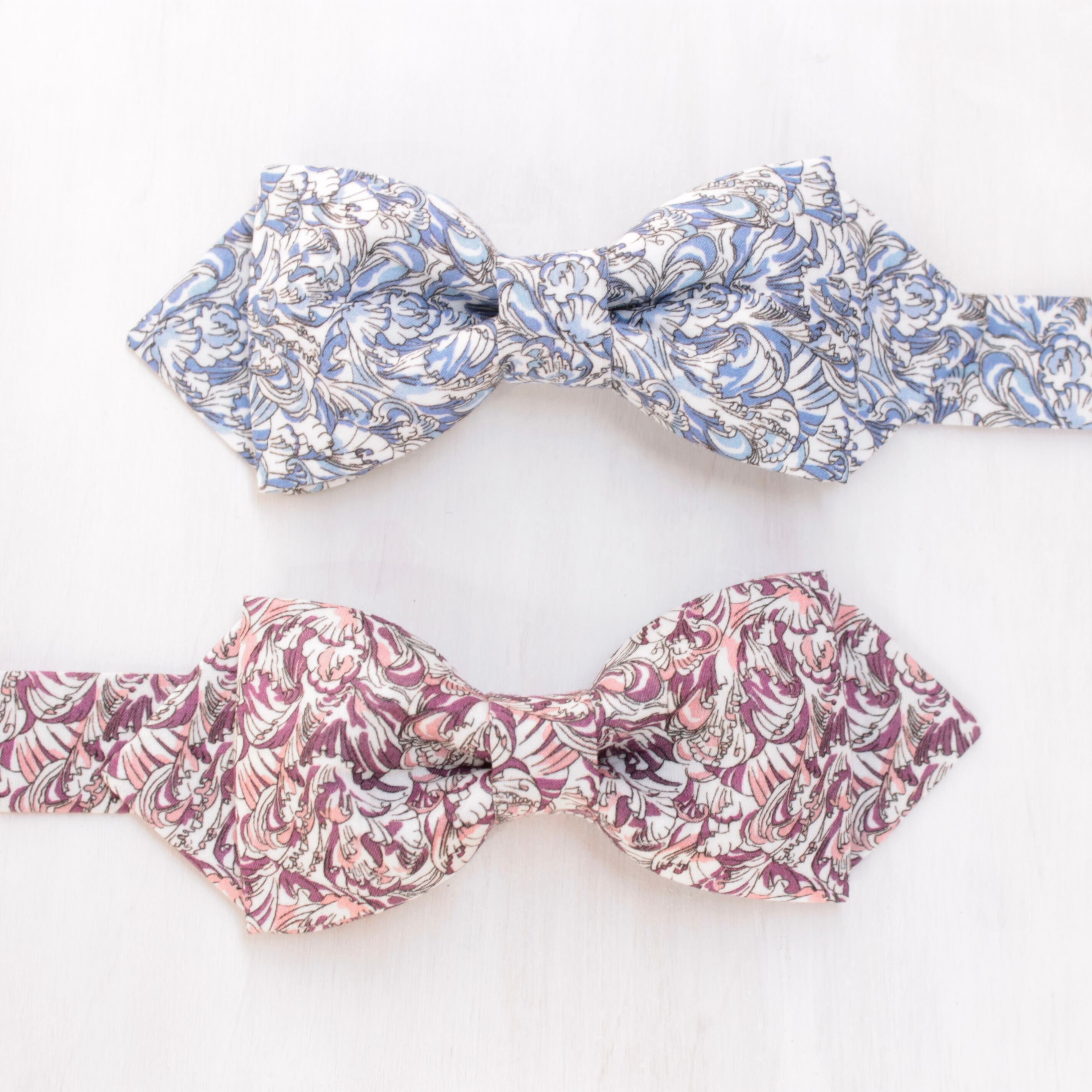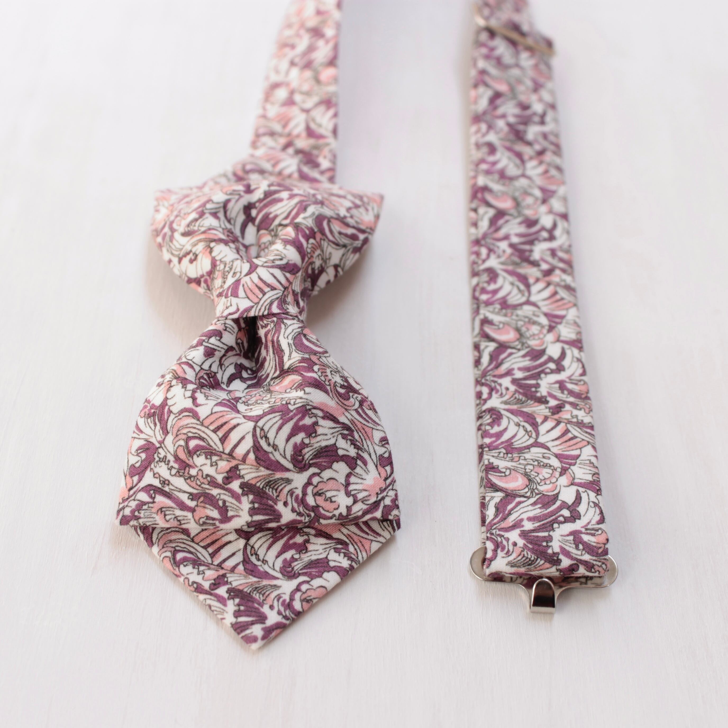 繊細なアールヌーボー調の模様が印象的な蝶ネクタイです。波打つ花弁の美しさを表現した上品なデザインで、蝶ネクタイが初めての方にもお使い頂きやすい、落ち着きのあるアイテムです。