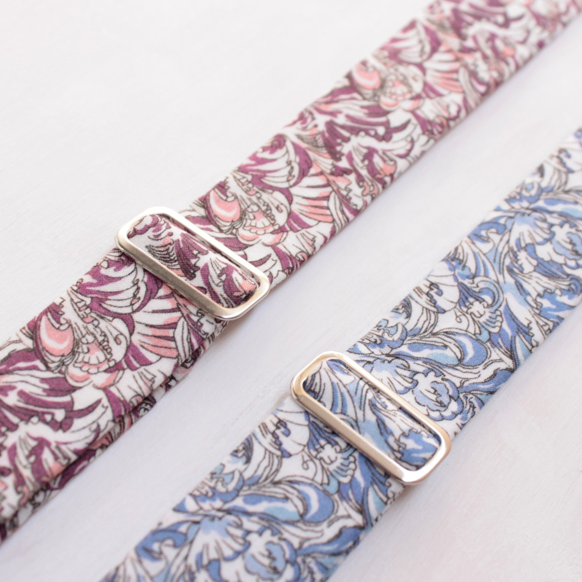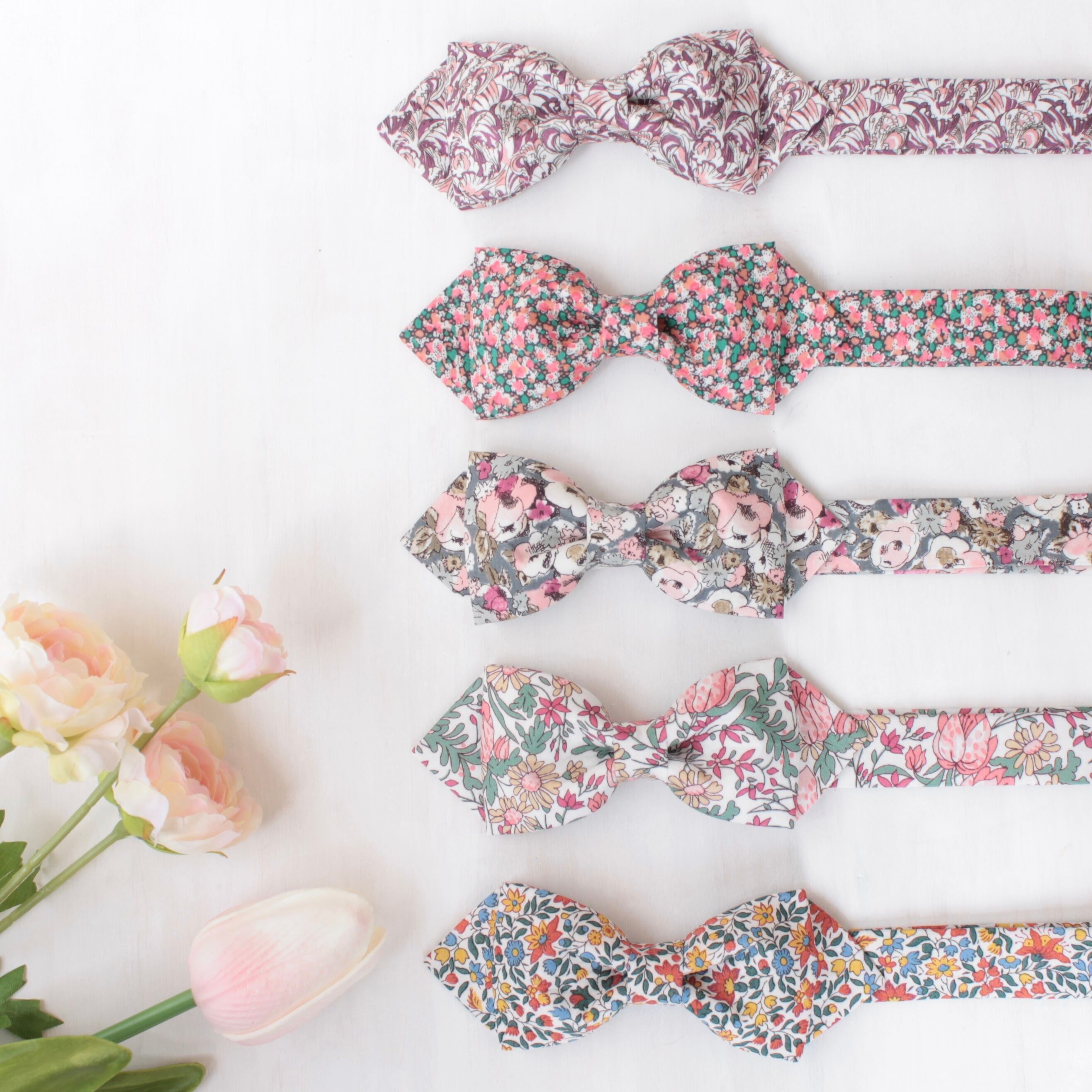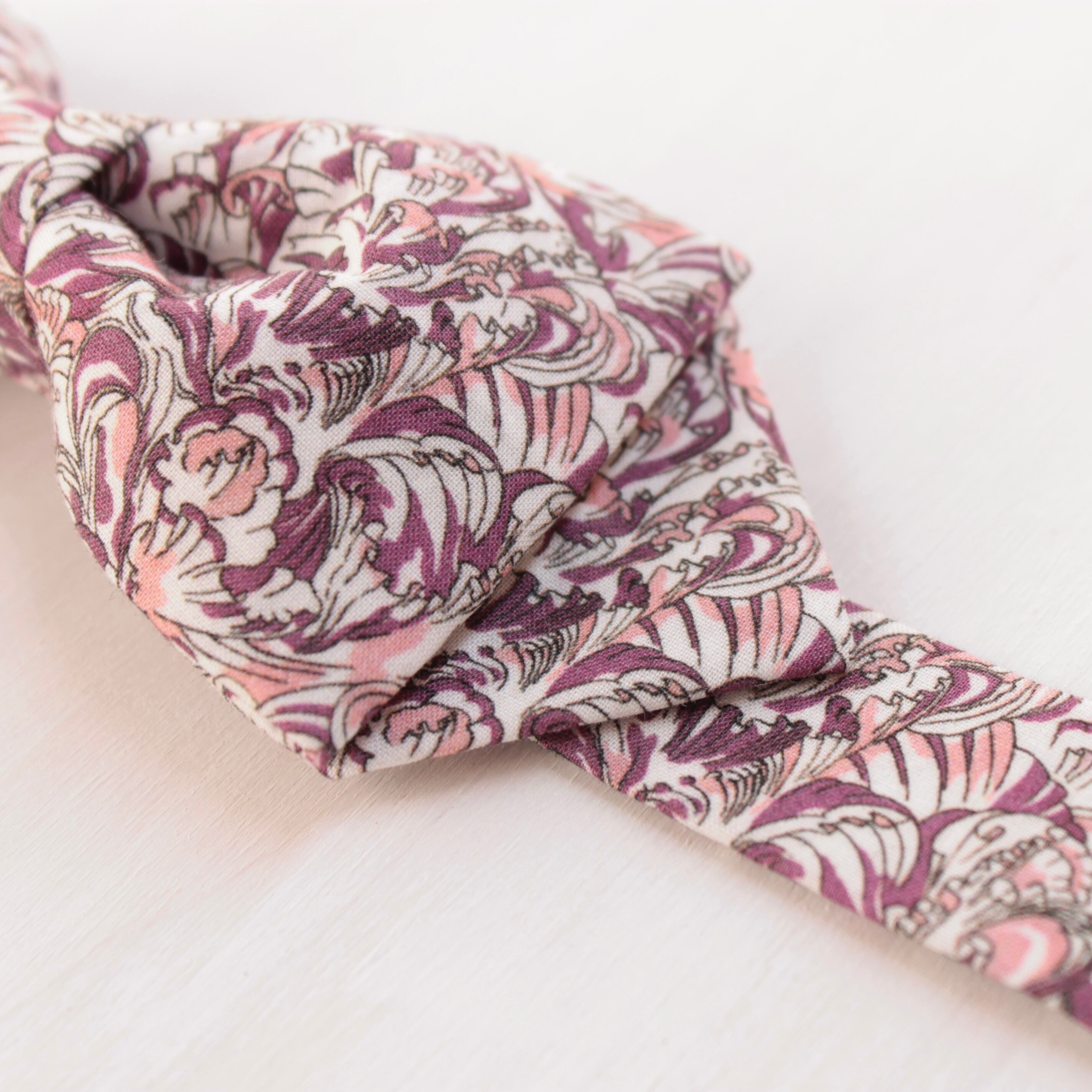 英国テキスタイルブランド、Liberty社の生地を使用しています。上質な光沢感と上品で華やかなデザインが特徴で、ハレの日はもちろん、カジュアルな装いへのワンポイントとしてもおすすめです。