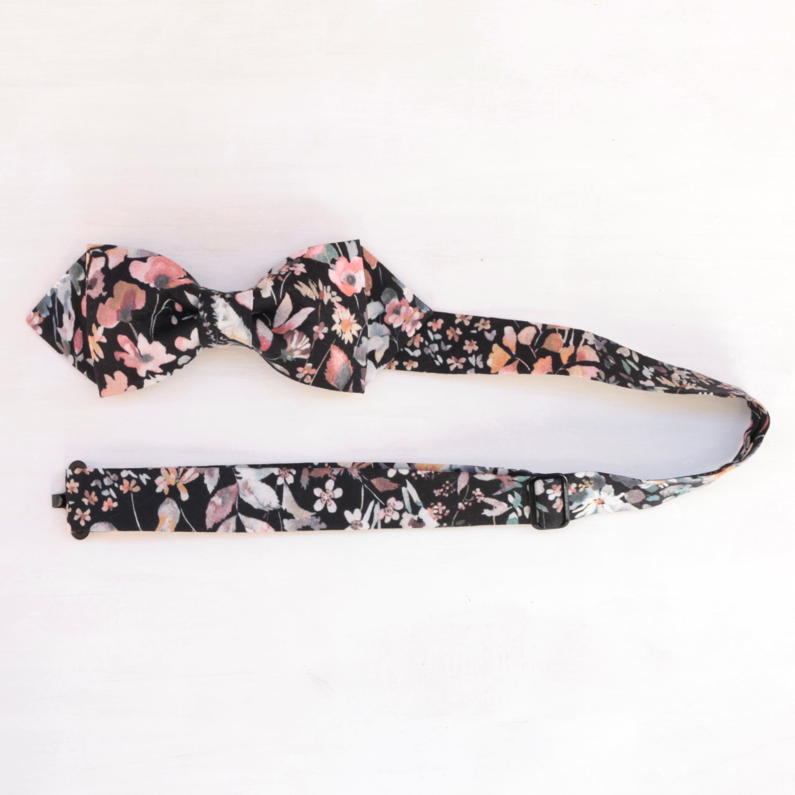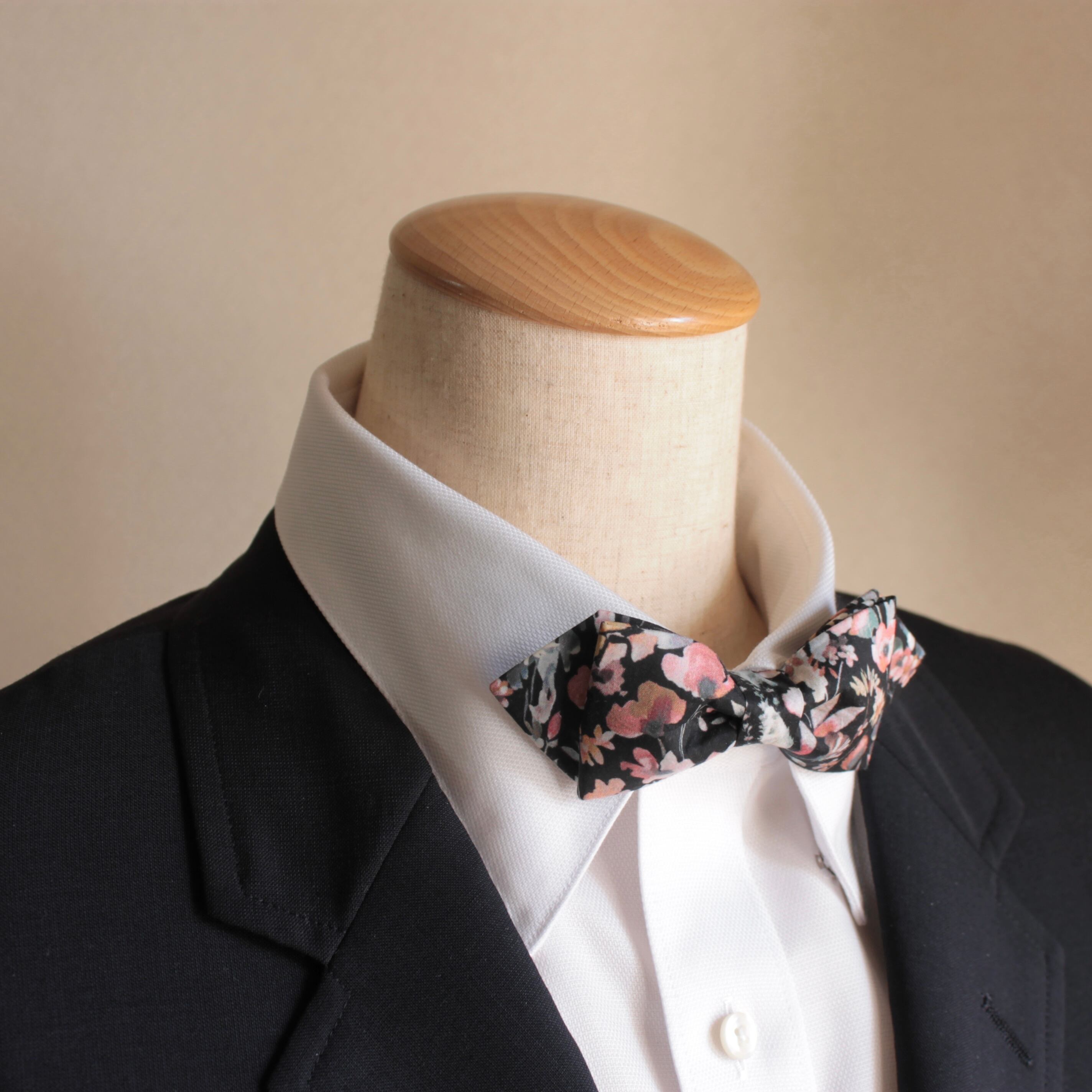ブラックベースの蝶ネクタイは、フォーマルな雰囲気は残しつつも華やかさがあり、初めての蝶ネクタイとしてもお使い頂きやすいです。ポピーやアヤメ、デイジーなどの可憐な花々が繊細に描かれており、水彩ならではの透明感のある美しさが楽しめる蝶ネクタイです。